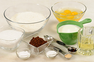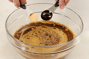 Adicione o óleo e o restante dos ingredientes secos previamente misturados.